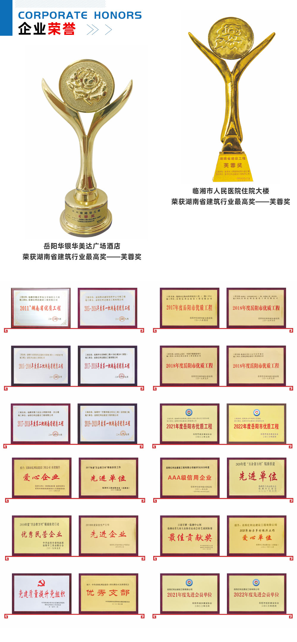 岳阳亿利达建设工程有限公司创立于1997年8月,注册资本10000万元,具有房建施工总承包一级资质,是临湘市建筑行业国家一级企业,年产值3亿多元,公司秉承“创新、效率、诚信、共赢”发展理念,业务立足湖南,辐射苏粤,承建工程严格按照质量标准化及优质工程标准组织施工,工程质量合格率100%,优质率达60%,近五年获省芙蓉奖2项,省优质工程6项,连年被省市主管部门评为工程质量安全管理先进单位、十佳建筑企业。